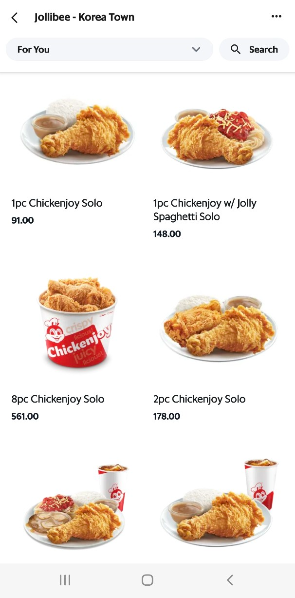 코로나 이후로 가격이 인상되었는데 최근 메뉴는 없어서 그랩에 있는 메뉴로 소개드리자면 주식이 후라이드 치킨이라는 말이 단순한 우스갯소리는 아닌 것이 가장 기본이라고 할 수 있는 메뉴가 1PC Chickenjoy, 치킨과 밥 한 덩이와 그레이비소스입니다. 실제 메뉴판에는 S1, S2, C1, C2 이런 식으로 이니셜과 숫자로 되어 있는데 S로 시작하는 메뉴는 스파게티 베이스, C로 시작하는 메뉴는 치킨 베이스 그리고 Y로 시작하는 메뉴는 졸리비의 햄버거인 얌버거 베이스를 의미합니다. 그리고 그 안에서 밥이냐 스파게티냐 버거스테이크냐 등으로 조합을 이루는 메뉴입니다.